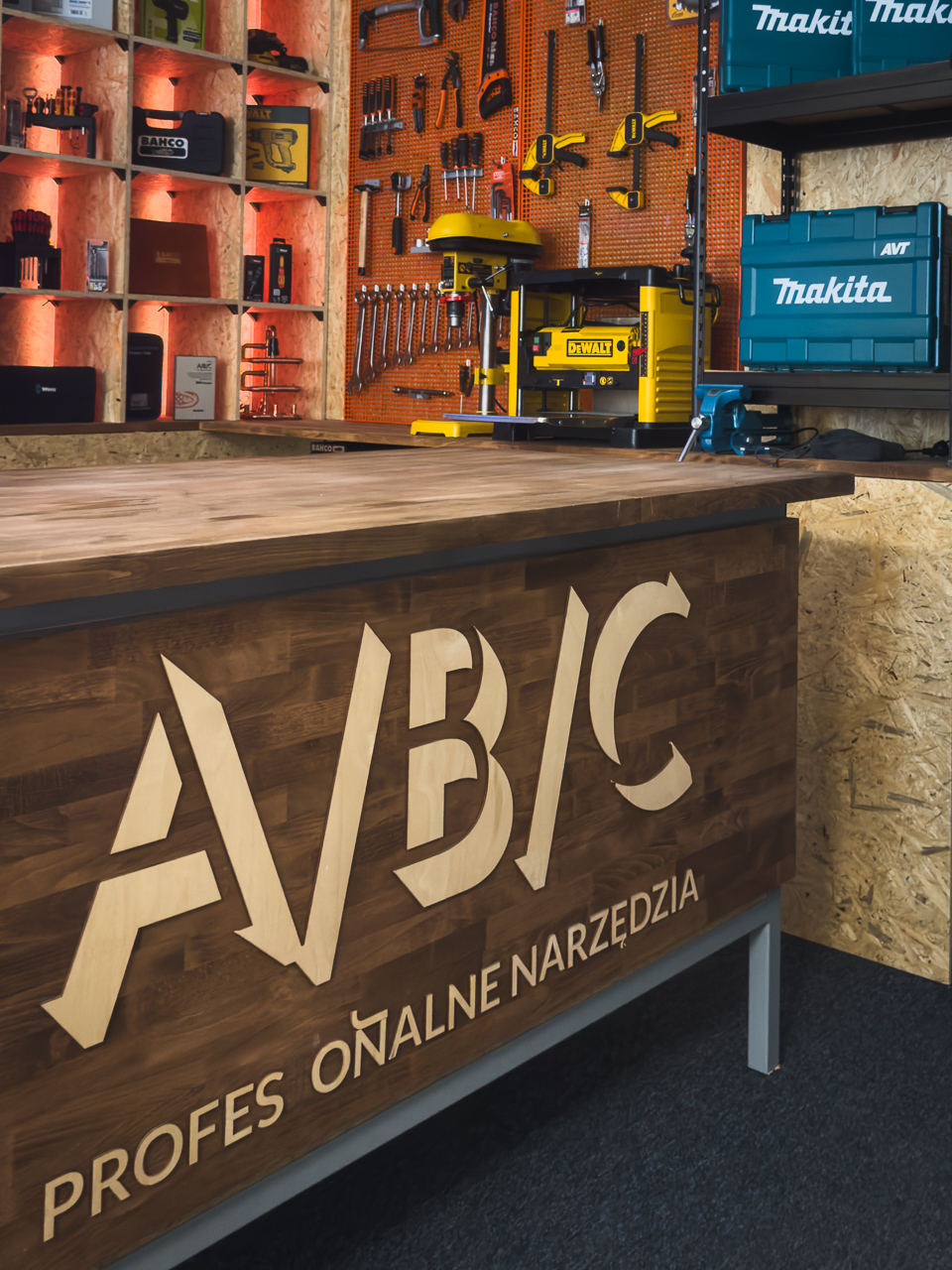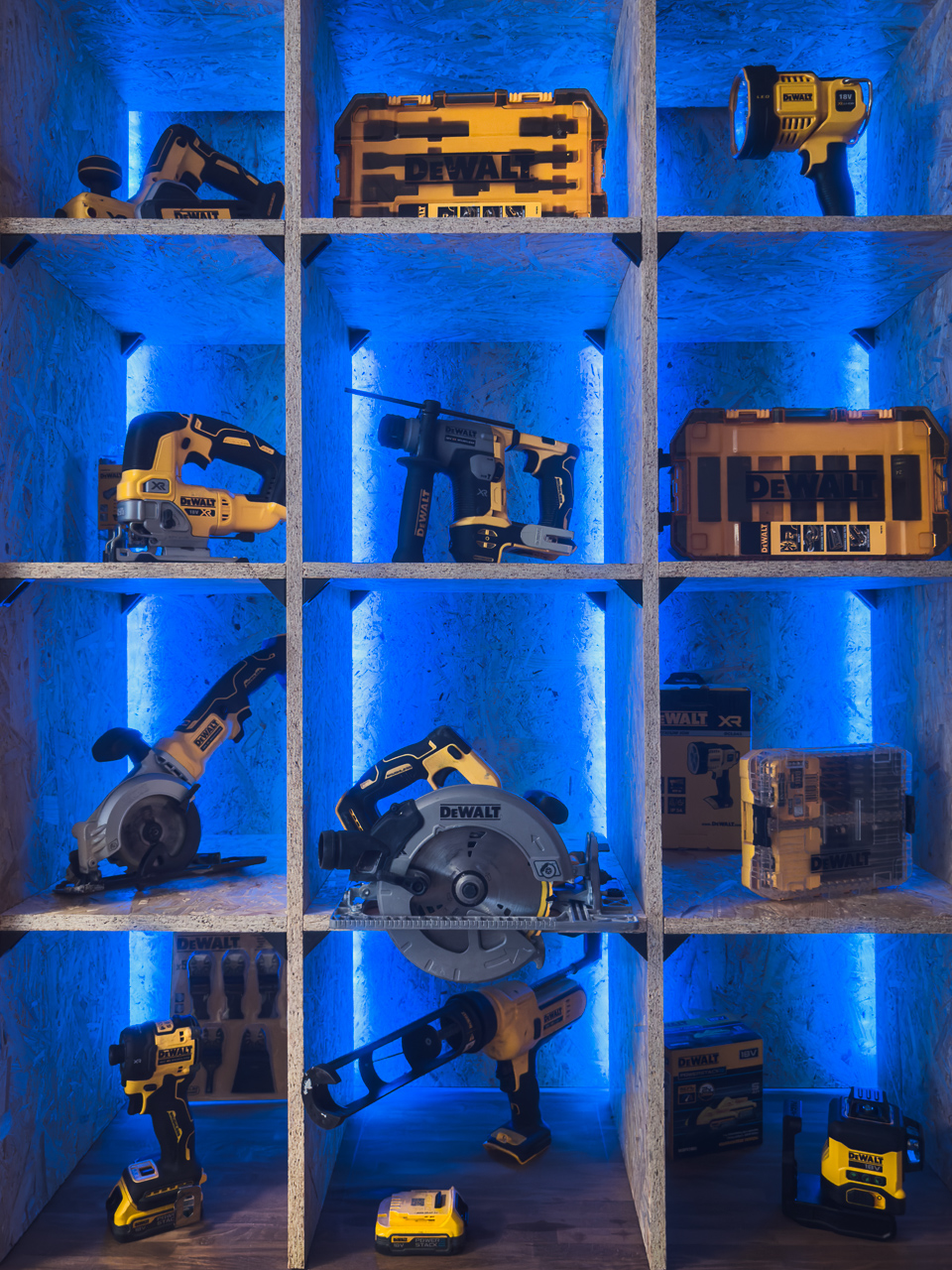 Tył regału podświetlony jest LED-owo w dwóch niezależnych sekcjach. Dzięki temu możemy zmieniać klimat scenografii w zależności od prezentowanego narzędzia czy marki.