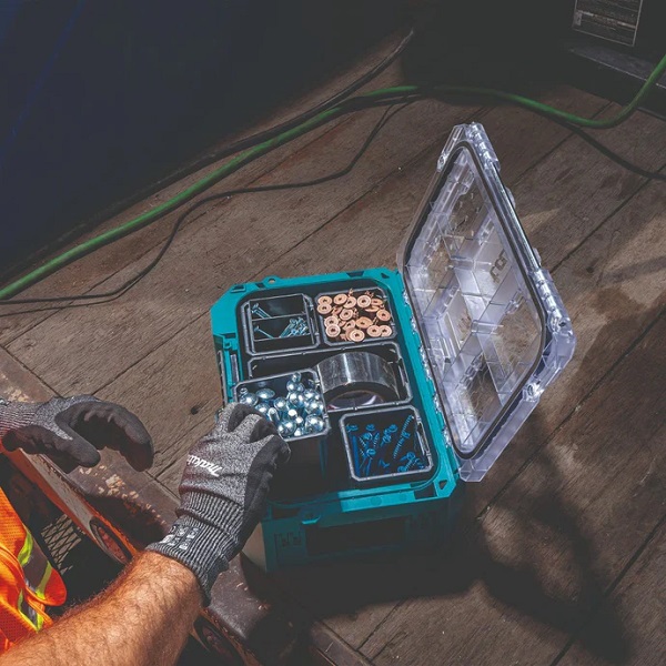 Każdy z tych organizerów posiada wyjmowane kubełki/przegrody wewnętrzne do segregacji drobnych części (np. śrub, nakrętek, końcówek itp.). Dzięki transparentnej pokrywie łatwo ocenić zapasy elementów na pierwszy rzut oka. Oczywiście wszystkie organizery można wpiąć w stos MAKTRAK, mocując je na większych skrzyniach lub obok siebie na pokrywie walizki na kółkach.