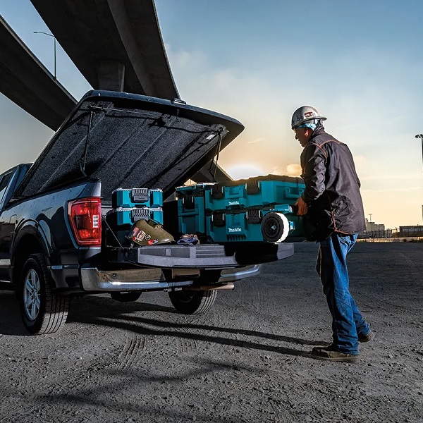 Mobilność i łatwy transport: System MAKTRAK zaprojektowano pod kątem wygodnego przemieszczania nawet w trudnym terenie. Podstawę stanowi walizka na kółkach P-91001 z dwoma dużymi, 9-calowymi kołami terenowymi, które ułatwiają ciągnięcie zestawu po nierównościach placu budowy. Zintegrowana, unikatowa rączka transportowa ma mechanizm teleskopowego składania, umożliwiający jednej osobie samodzielne załadowanie całego zestawu do bagażnika lub na skrzynię pick-upa. Uchwyty wyposażono w specjalne antypoślizgowe nakładki Gecko Grips™, zapewniające pewny chwyt przy podnoszeniu i wkładaniu skrzyń. Na poniższej fotografii widać, jak konstrukcja pozioma i składana rączka ułatwiają załadunek zestawu MAKTRAK do samochodu dostawczego, bez konieczności rozłączania modułów: