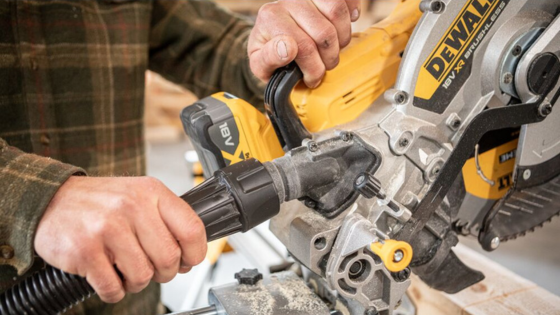 Ukośnica współpracuje z systemem AIRLOCK™ oraz może łączyć się bezprzewodowo z odkurzaczami DEWALT wyposażonymi w Wireless Tool Control.
