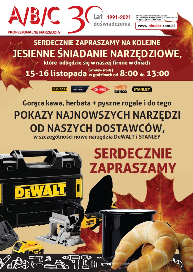 Serdecznie zapraszamy na śniadanie narzędziowe, które odbędzie się w siedzibie naszej firmy w Bielsku-Białej, przy ul. Strażackiej 37, w dniach 15-16 listopada 2022 r. w godzinach od 8:00 do 13:00.