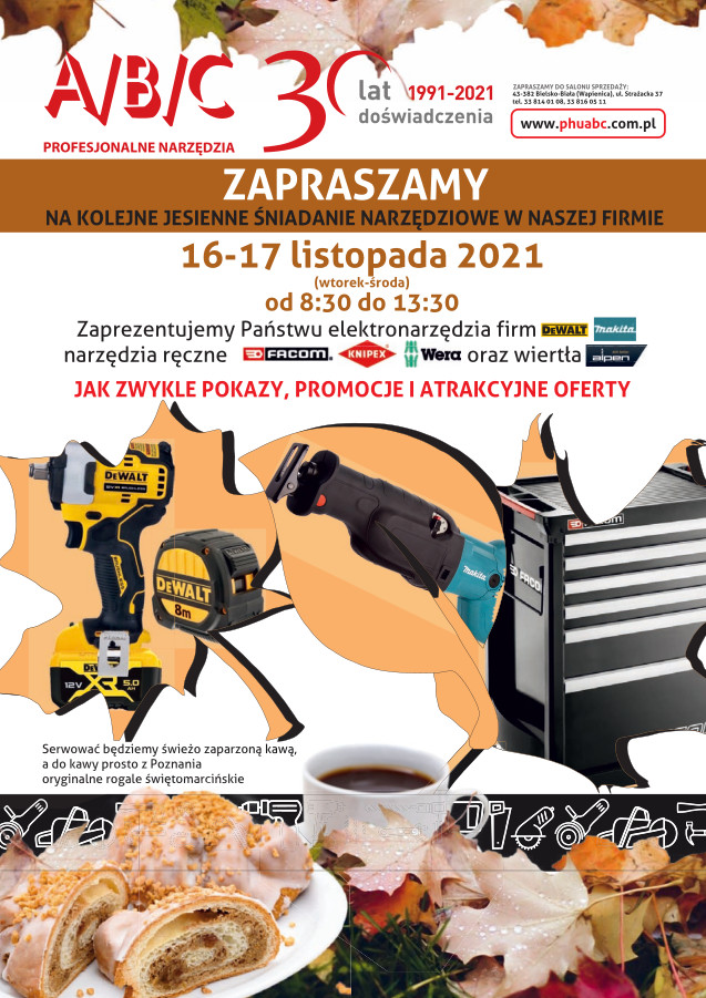 Serdecznie zapraszamy na śniadanie narzędziowe, które odbędzie się w siedzibie naszej firmy w Bielsku-Białej, przy ul. Strażackiej 37, w dniach 16-17 listopada 2021, w godzinach od 8.30 do 13.30.