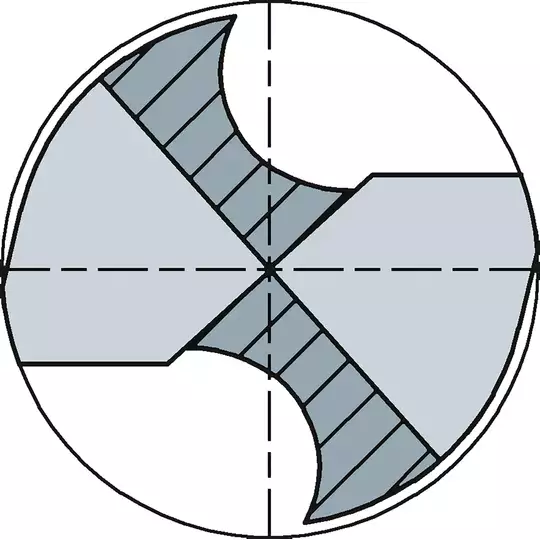 - dzięki krzyżowemu ostrzeniu wierzchołka (split point) nie jest wymagane punktowanie aby rozpocząć wiercenie precyzyjnie w żądanym punkcie, kąt wierzchołkowy to 135°,
