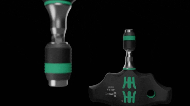 Dwukomponentowa rękojeść typu T z funkcją grzechotki (80 zębów, kąt pracy 4,5°) [05023461001] z wygodnie umieszczonym przełącznikiem kierunku prawo/lewo posiada szybkomocujący uchwyt do końcówek Rapidator, dzięki czemu wymiana końcówek jest szybka i łatwa. Rękojeść przeznaczona jest do końcówek z mocowaniem na sześciokąt 1/4".