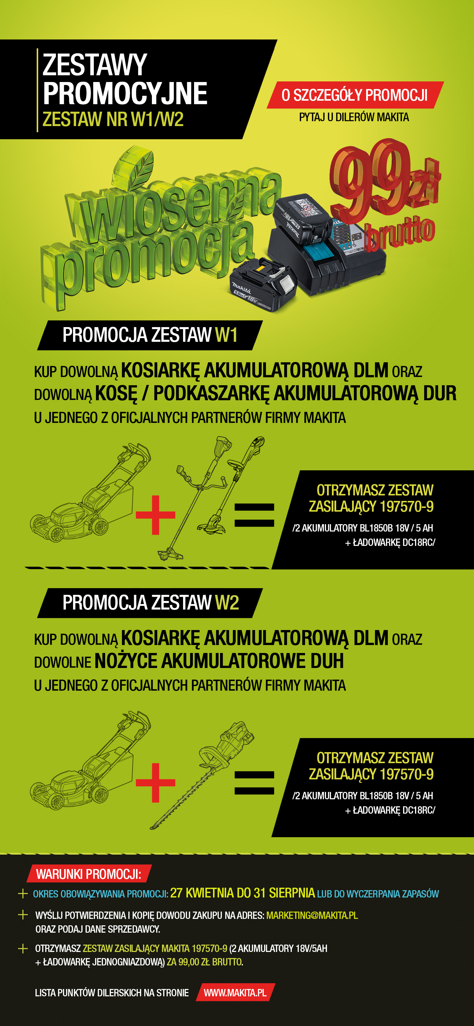 - Po otrzymaniu wiadomości od Ciebie, zawierającej potwierdzenie zakupu i rejestracji narzędzi, prześlemy na Twój adres e-mail kod rabatowy obniżający cenę zestawu zasilającego Makita 197570-9 do 99zł brutto.